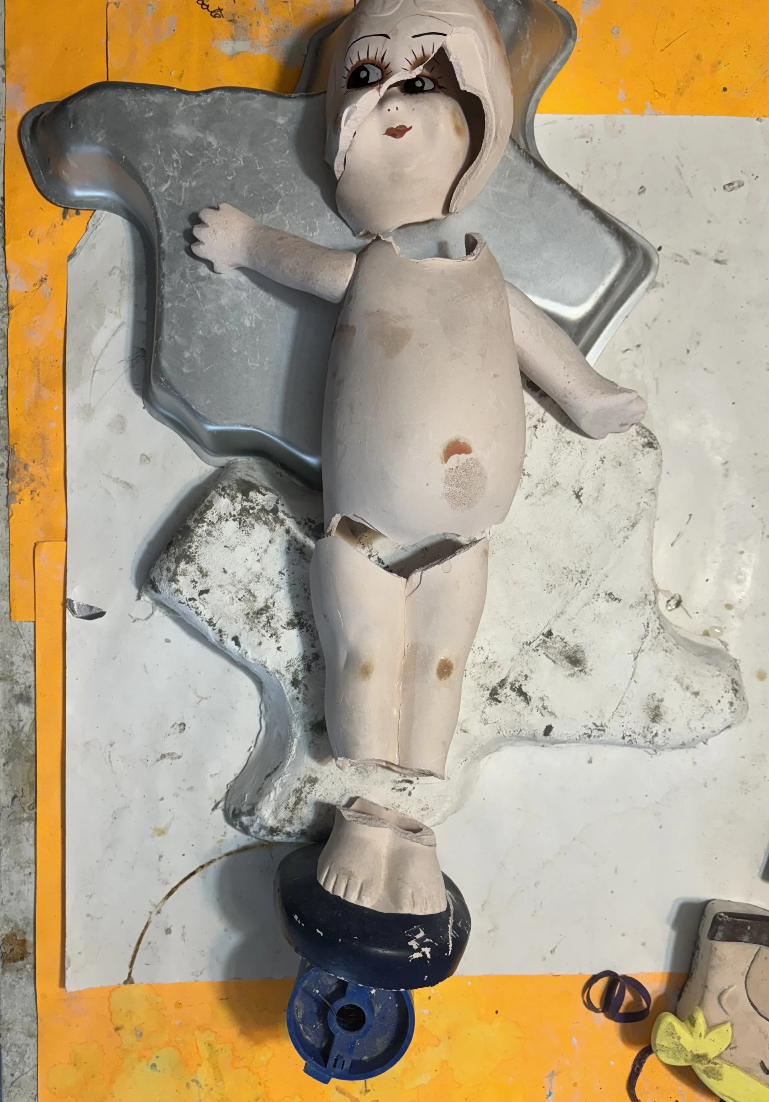 Chalkware doll on inverted aluminum cake pan